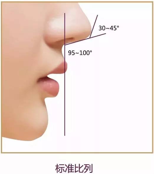 理想的侧面鼻小柱与人中呈95~100度,鼻头与鼻小柱呈30~45度。