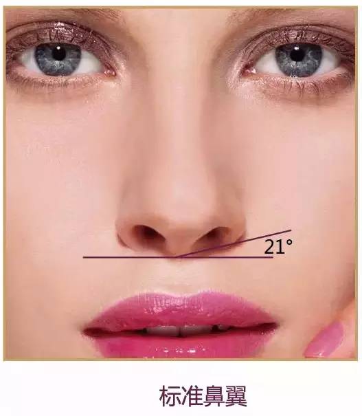 理想的鼻外形为上窄下宽呈斜形,其斜面与面部相交呈21-25度。